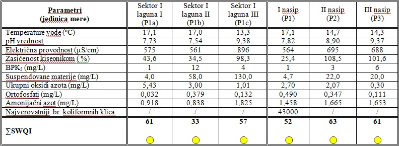 Indikatori kvaliteta površinskih voda metodom Serbian Water Quality Index dobijeni su korelacijom pokazatelja kvaliteta sa Uredbom o klasifikaciji voda ,  Sl. glasnik SRS”, 5/68.
