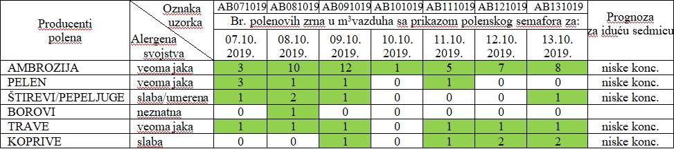 1 do 30 pz/m3 | 1 do 15 pz/m3 | koncentracije polena koje kod izuzetno osetljivih osoba mogu