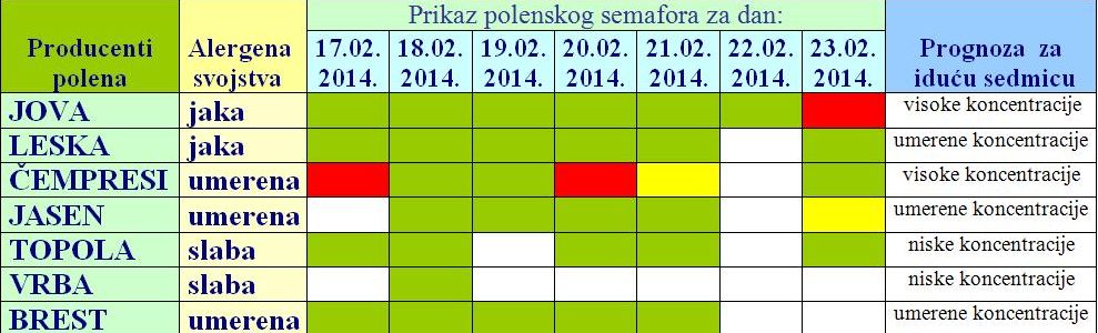 koncentracije polena koje mogu izazvati veoma jake alergijske