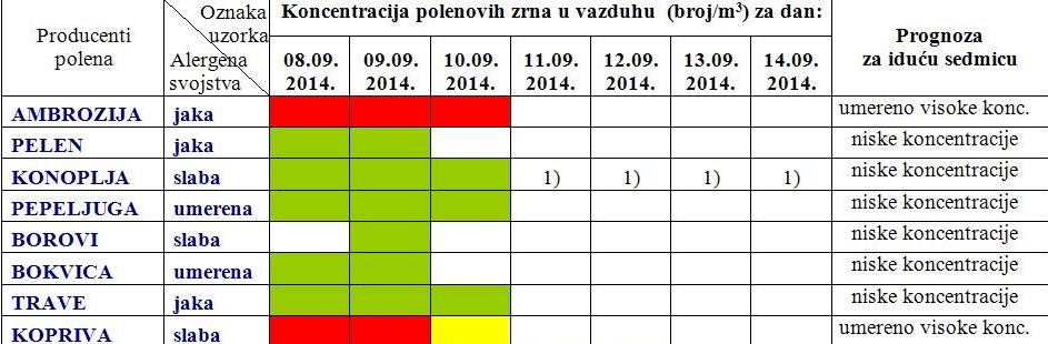Napomena – 1) Zbog tehničkih problema, ne postoje podaci za 11.,12.,13. i 14.09.2014.
