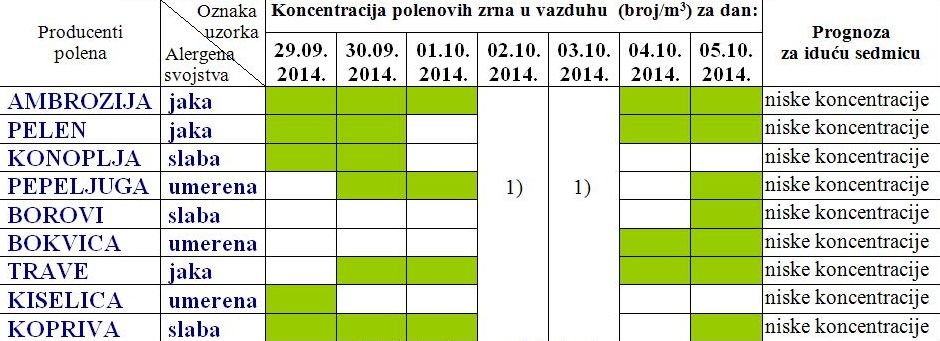 Napomena – 1) Zbog tehničkih problema, ne postoje podaci o stanju polena za 2. i 3.10.2014.