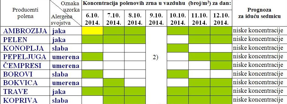 Napomena – 2) Zbog tehničkih problema, ne postoje podaci o stanju polena 9.10.2014.