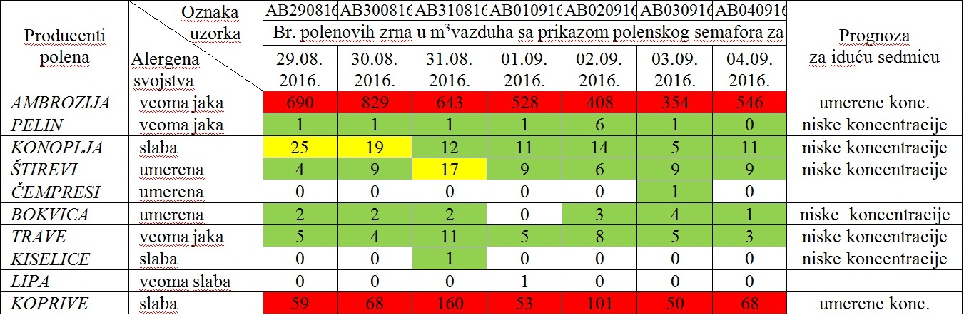 1 do 30 pz/m3 | 1 do 15 pz/m3 | koncentracije polena koje kod izuzetno osetljivih osoba mogu