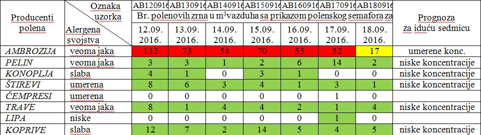 1 do 30 pz/m3 | 1 do 15 pz/m3 | koncentracije polena koje kod izuzetno osetljivih osoba mogu
