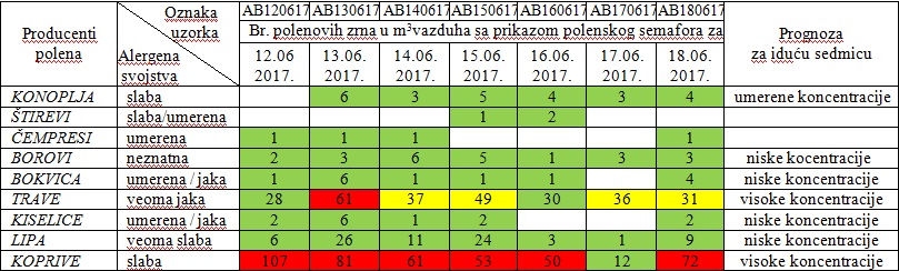 1 do 30 pz/m3 | 1 do 15 pz/m3 | koncentracije polena koje kod izuzetno osetljivih osoba mogu