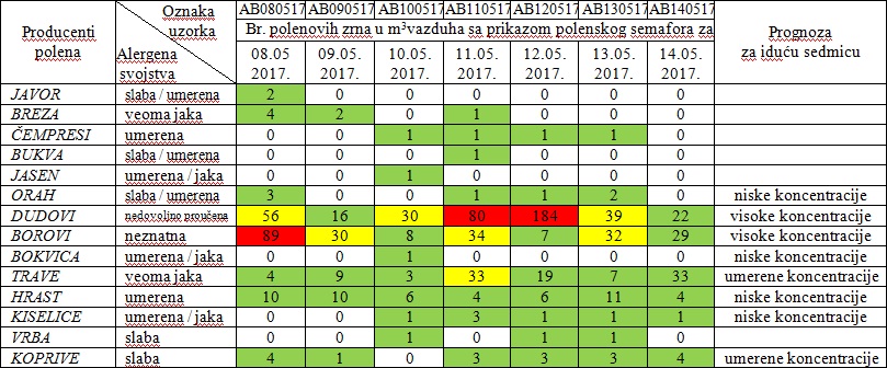 1 do 30 pz/m3 | 1 do 15 pz/m3 | koncentracije polena koje kod izuzetno osetljivih osoba mogu