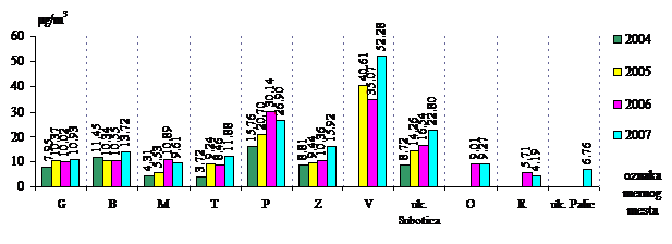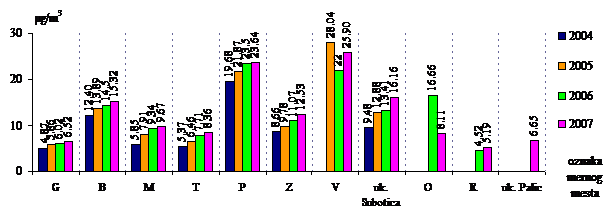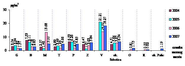 - Izmerene koncentracije čađi tokom 2007. godine kretale su se od 0 do 324μg/m3, prosečna vrednost u Subotici je 22.80μg/m3, znatno veća nego 2006. godine (16.54μg/m3), na Paliću je 6.76μg/m3. Najveći mesečni prosek i naviše dana sa prekoračenjem GVI zabeležen je u oktobru (30.08 μg/m3 i 324 prekoračenja GVI), a najmanji u maju (8.19 μg/m3 i 7 prekoračenja GVI). GVI za nastanjena područja (50 μg/m3) prekoračena je 242 puta (2006. -146, 2005.-100 puta), od toga 162 puta na mernom mestu Vatrogasna stanica i 60 puta kod Hotela „Patria“. Maksimalna dnevna koncentracija od 324μg/m3 izmerena je u oktobru na lokalitetu Vatrogasna stanica. Prosečna vrednost pozadinske imisije čađi je 4.19μg/m3.