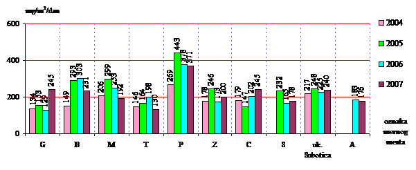 - Izmerene koncentracije sumpor-dioksida u 2007. godini kretale su se u opsegu između granice kvantifikacije i 115μg/m3. Prosečna koncentracija na teritoriji Subotice je 6.54μg/m3, viša nego 2006. godine (5.67μg/m3), a na Paliću je 1.19μg/m3. Najveći mesečni prosek na teritoriji Subotice je martovski- 8.71μg/m3, a najmanji majski -2.42 μg/m3. Maksimalna koncentracija od 115μg/m3 izmerena je u martu na lokalitetu Industrijska zona Aleksandrovo. Prekoračenja granične vrednosti (150μg/m3) 2007. godine nije bilo, a u 2006. pet puta. Prosečna godišnja vrednost pozadinske imisije (izmereno na mernom mestu Ribarska baraka na Paliću) je 0.62μg/m3.