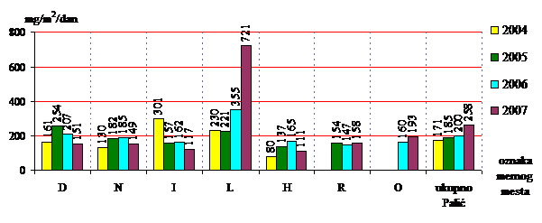 - Količine ukupnih taložnih materija na teritoriji Subotice tokom 2007. godine u četiri navrata su premašile dozvoljenu mesečnu GVI od 450mg/m2/dan (Bolnica, Industrijska zona Aleksandrovo, i dva puta kod Hotela „Patria“), a na Paliću pet puta, sve na mernom mestu kod priključka na autoput sever. Godišnja granična vrednost od 200mg/m2/dan u Subotici prekoračena je na 5 lokaliteta (Građevinski fakultet, Bolnica, Hotel „Patria“, ZZZZ i Mesara Matijević), a na Paliću na jednom. Godišnji prosek UTM na teritoriji Subotice je 258mg/m2/dan, na Paliću 240mg/m2/dan, oba iznad GVI.
