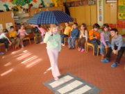 Vežbamo pravilan prolaz na pešačkom prelazu. Posle „otežavamo“ zadatak sa kišobranom i kapuljačom.